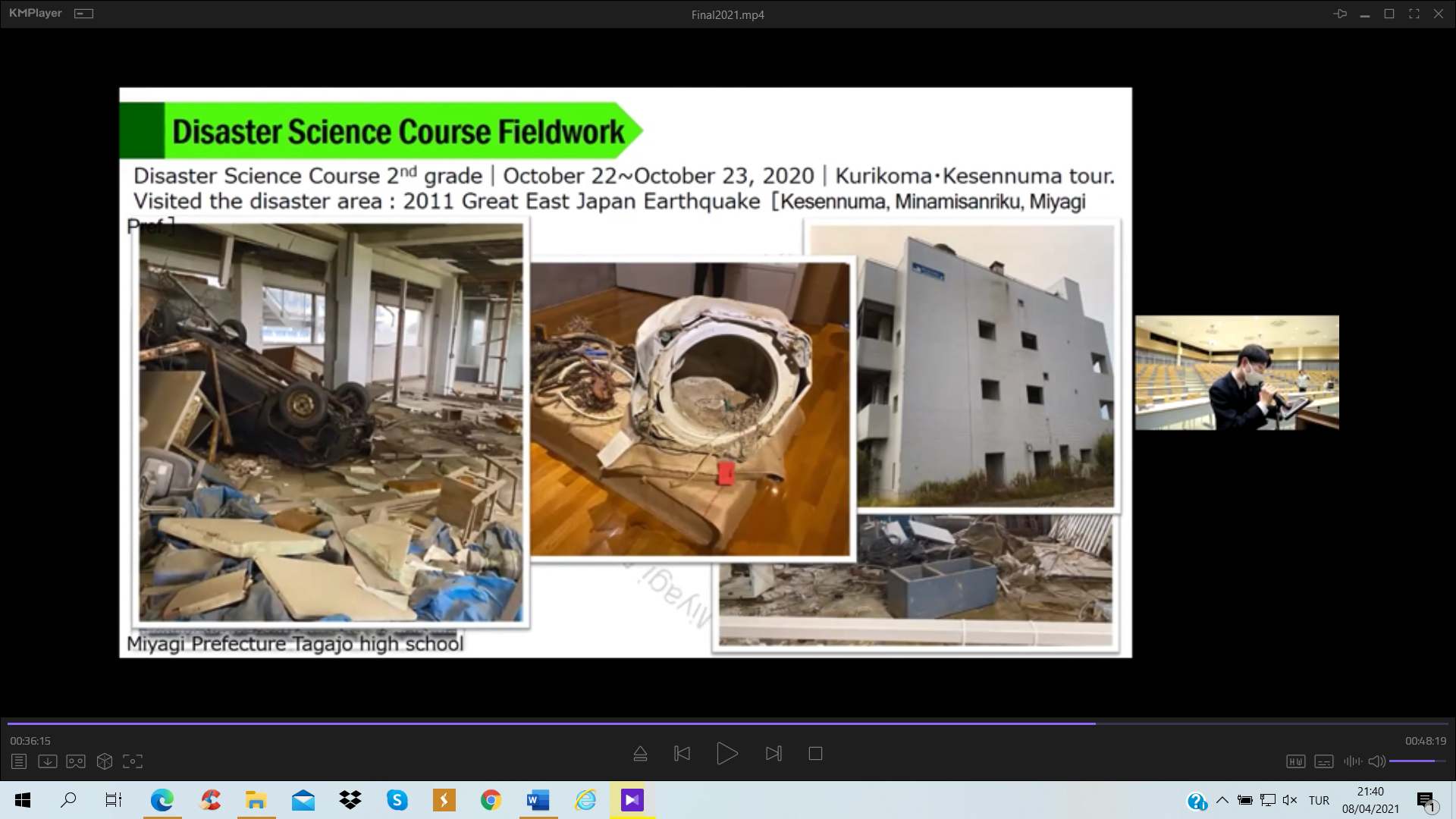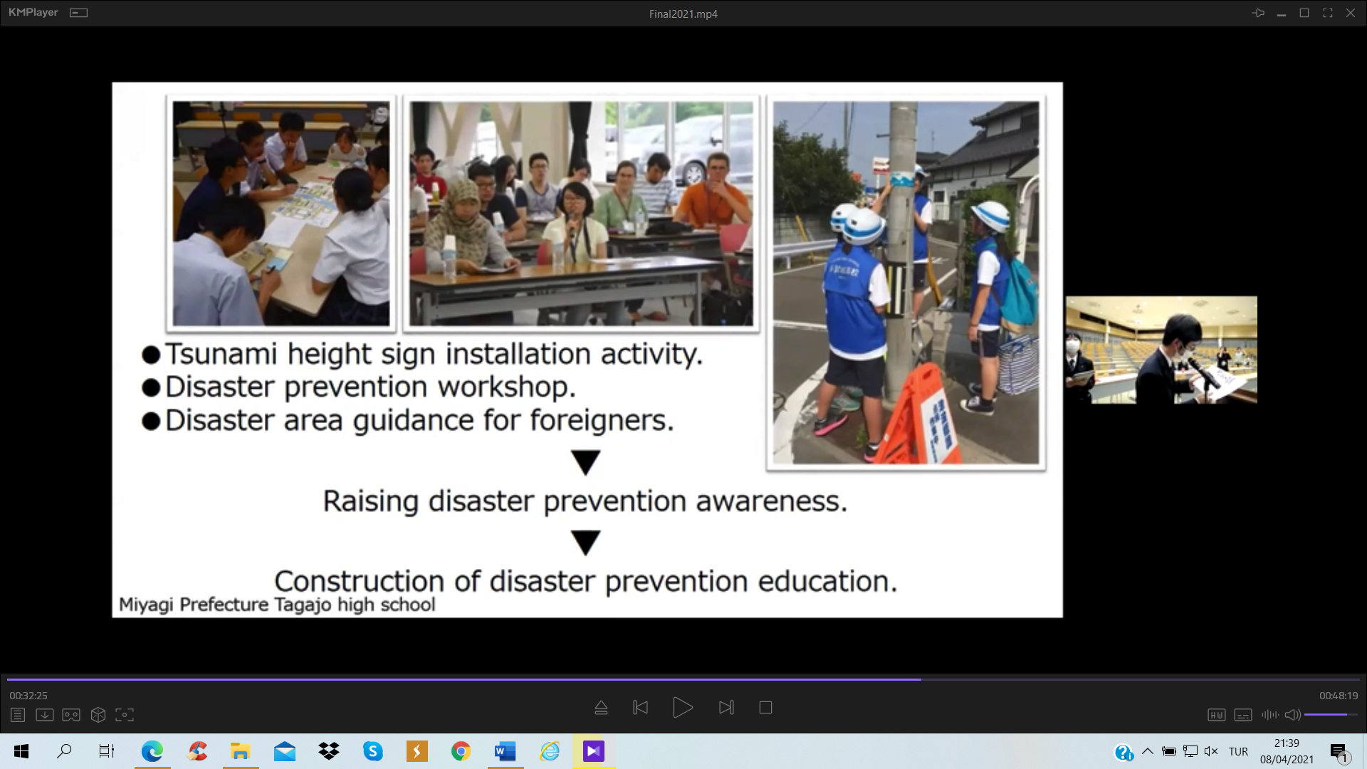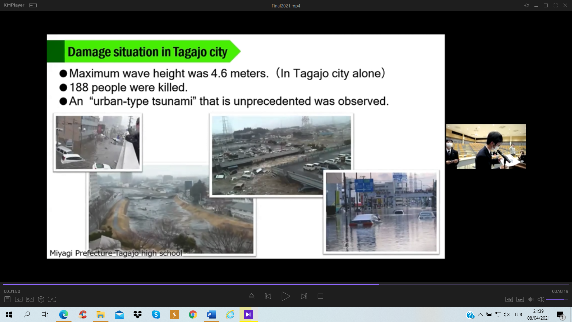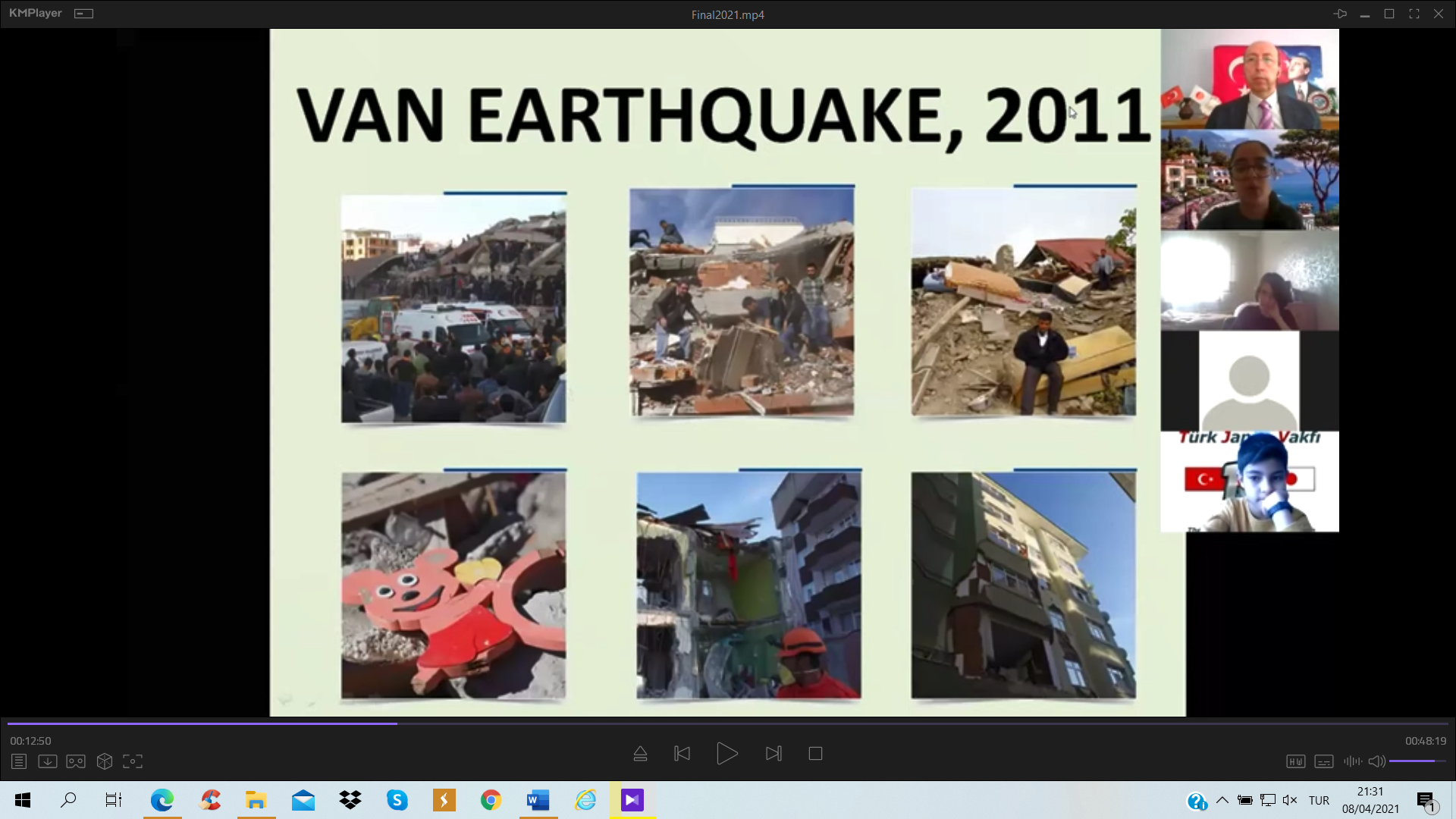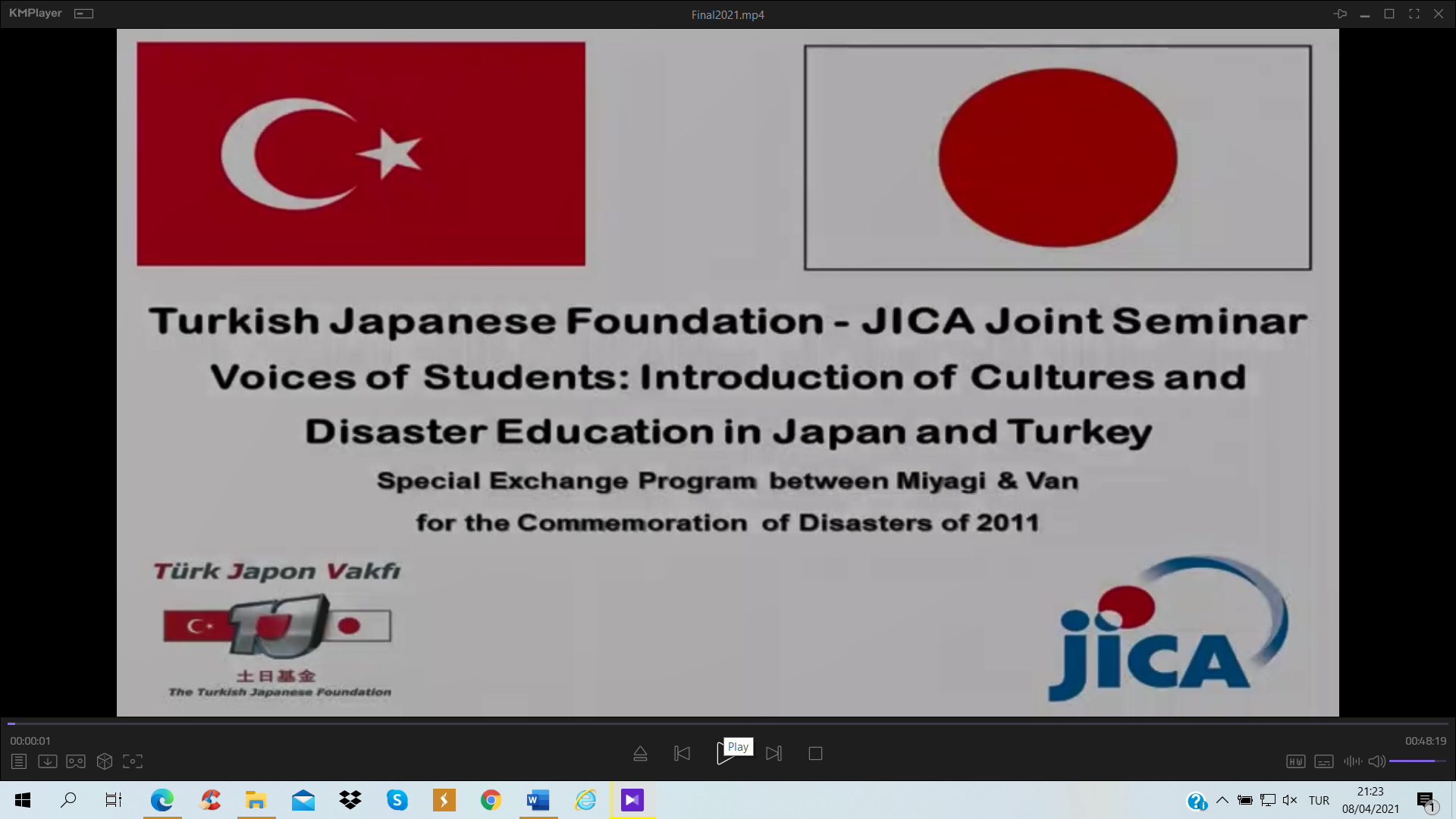 Türk Japon Vakfı (TJV) ve Japonya Uluslararası İşbirliği Ajansı (JICA) Türkiye Ofisinin Covid-19 salgını döneminde yürüttüğü “Voices of Students; Introduction of Turkey & Japan” – “Öğrencilerin Sesinden; Türkiye ve Japonya Tanıtımı” çevrimiçi seminerlerinin dokuzuncusu 2011 yılında yıkıcı afetler yaşamış olan Miyagi ve Van illeri arasında, bu afetlerin “10. Yılı Anısına” 20 Mart 2021 tarihinde gerçekleştirildi. Bilindiği üzere 11 Mart 2011’de Japonya’nın kuzeydoğusunda büyük bir deprem ve peşinden tsunami felaketi yaşanmış ve 23 Ekim tarihinde ise bu kez Van’da yıkıcı bir deprem meydana gelmişti. Bu afetlerin 10’uncu yıldönümünde gerçekleştirilen özel değişim programında, 2011’deki afetleri yaşamış Miyagi ilindeki Tagajo Lisesi öğrencileri ile Van Erciş’deki Tenzile Ana Ortaokulu öğrencileri yaptıkları sunumlarla hem bu afetleri andı hem de Türk ve Japon kültürü, afet risk azaltma ve afet eğitimi konularında bilgi paylaşımında bulundu.