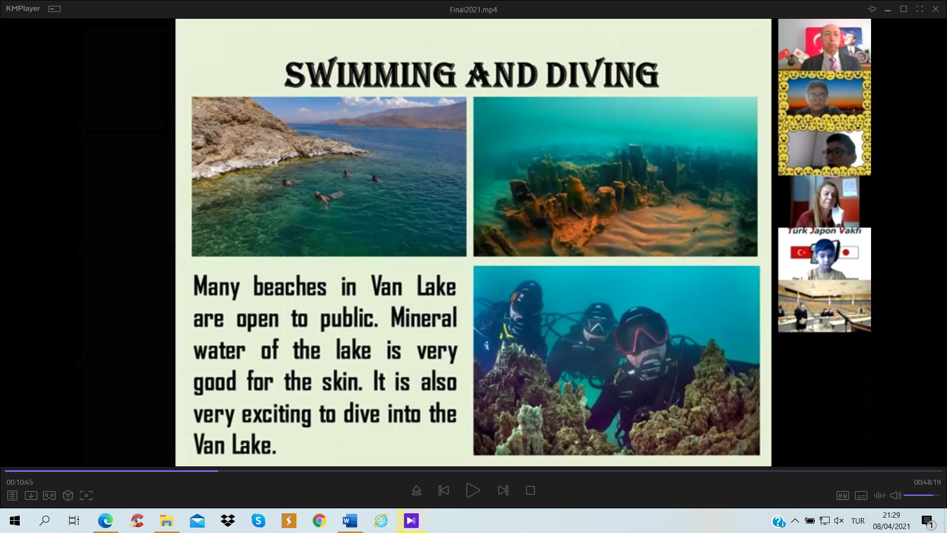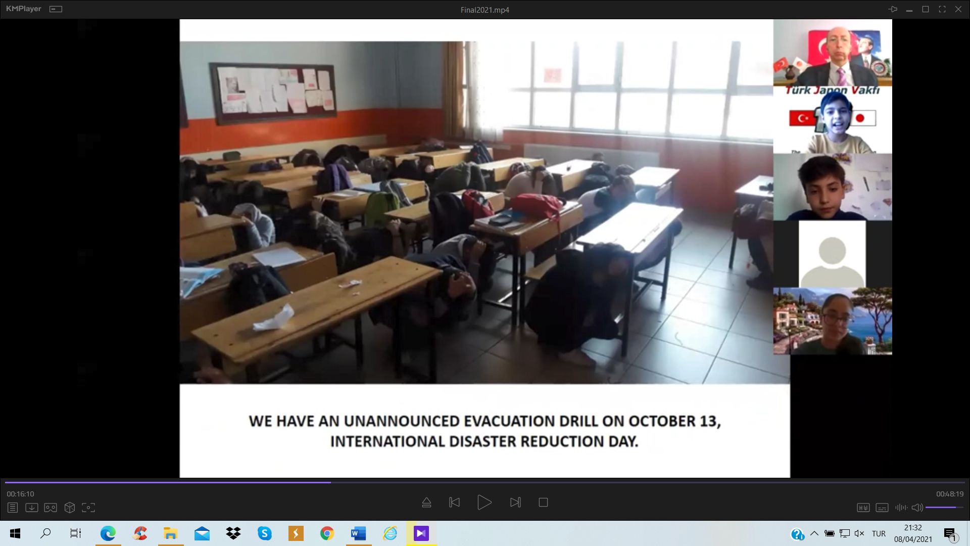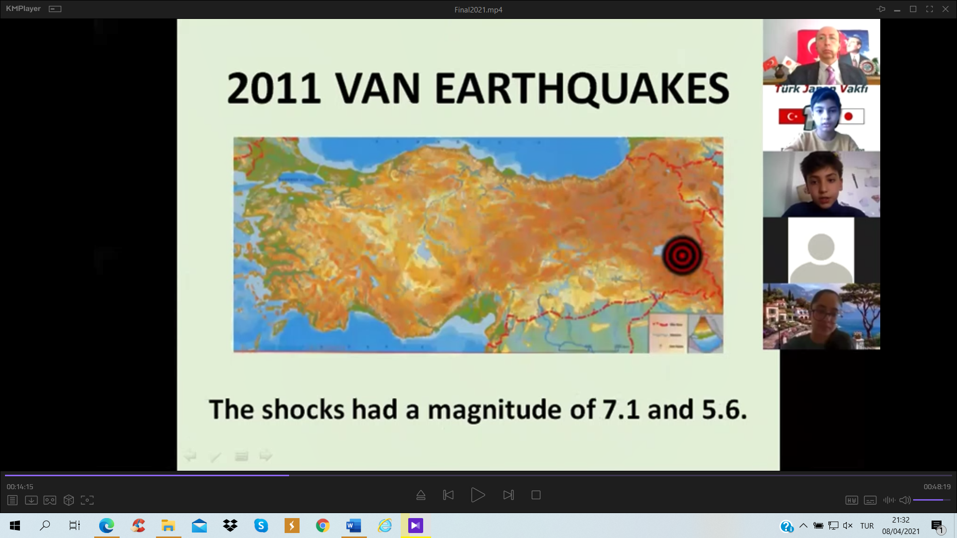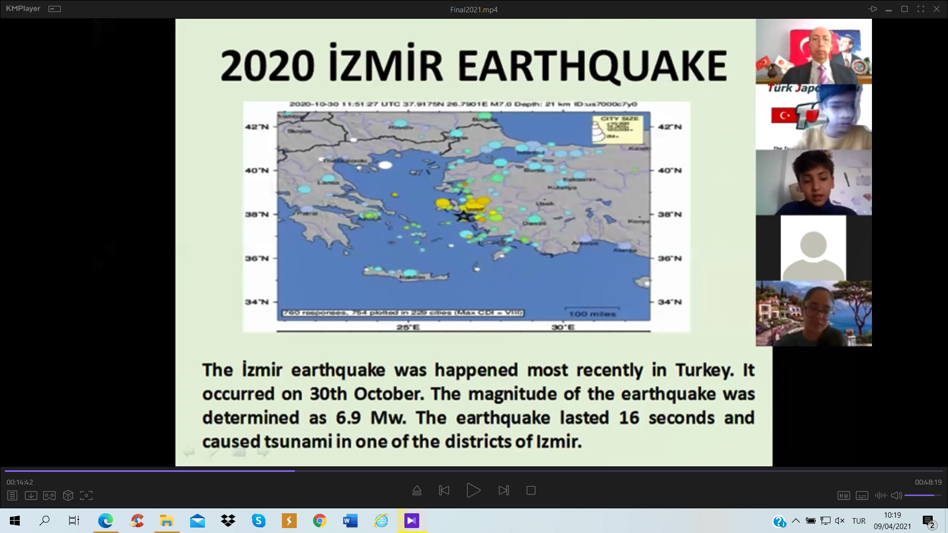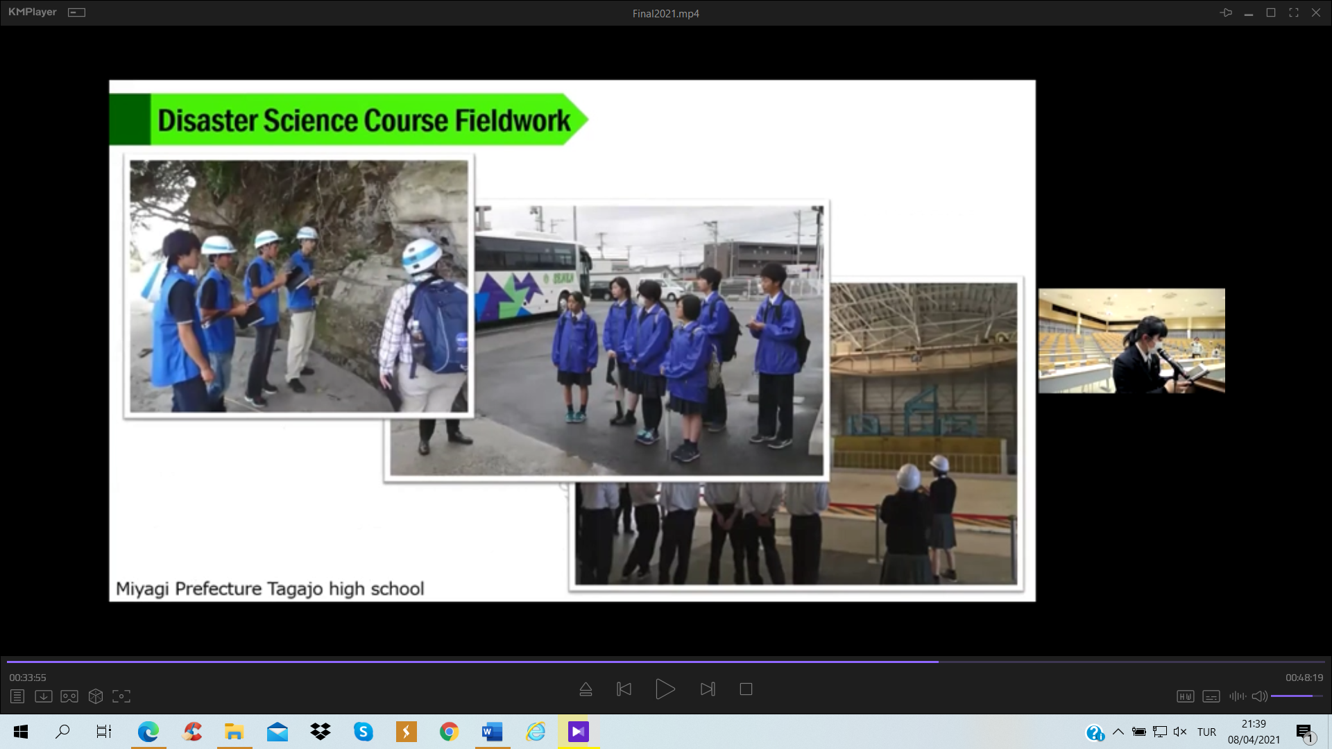 Türk Japon Vakfı (TJV) ve Japonya Uluslararası İşbirliği Ajansı (JICA) Türkiye Ofisinin Covid-19 salgını döneminde yürüttüğü “Voices of Students; Introduction of Turkey & Japan” – “Öğrencilerin Sesinden; Türkiye ve Japonya Tanıtımı” çevrimiçi seminerlerinin dokuzuncusu 2011 yılında yıkıcı afetler yaşamış olan Miyagi ve Van illeri arasında, bu afetlerin “10. Yılı Anısına” 20 Mart 2021 tarihinde gerçekleştirildi. Bilindiği üzere 11 Mart 2011’de Japonya’nın kuzeydoğusunda büyük bir deprem ve peşinden tsunami felaketi yaşanmış ve 23 Ekim tarihinde ise bu kez Van’da yıkıcı bir deprem meydana gelmişti. Bu afetlerin 10’uncu yıldönümünde gerçekleştirilen özel değişim programında, 2011’deki afetleri yaşamış Miyagi ilindeki Tagajo Lisesi öğrencileri ile Van Erciş’deki Tenzile Ana Ortaokulu öğrencileri yaptıkları sunumlarla hem bu afetleri andı hem de Türk ve Japon kültürü, afet risk azaltma ve afet eğitimi konularında bilgi paylaşımında bulundu.