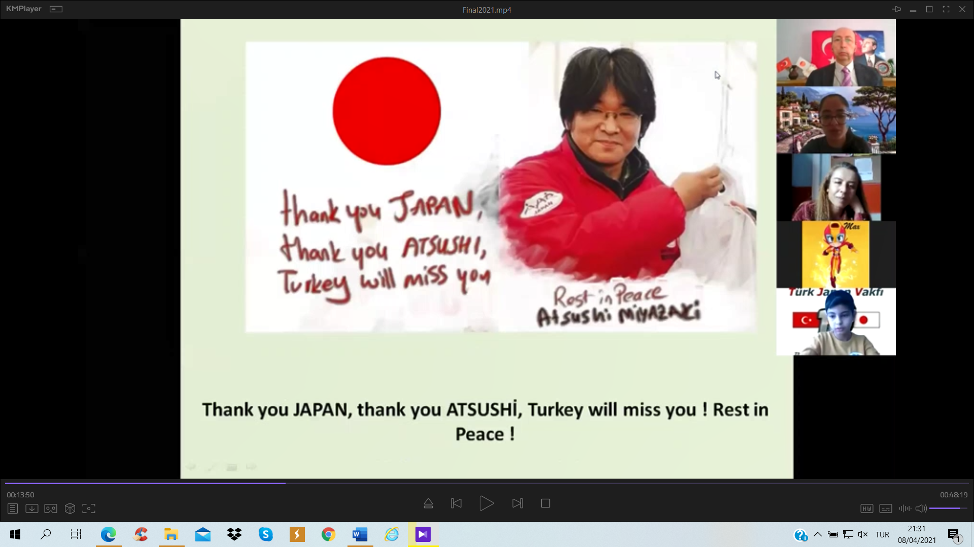 Programa katılımları ve konuşmalarıyla bizleri onurlandıran Japonya’nın Türkiye Büyükelçisi sayın SUZUKI Kazuhiro’ya, JICA Türkiye Ofisi Başkanı IKURO Nobuhiro’ya, Türk Japon Vakfı Başkanı Prof. Dr. Nejat Bora SAYAN’a, Tagajo Lisesi Müdürü GORAI Ikuto’ya, Tenzile Ana Ortaokulu Müdürü Resul GEZİCİ’ye ve Miyagi Eğitim Üniversitesinden Doç. Dr. ODA Takashi’ye çok teşekkür ederiz.
